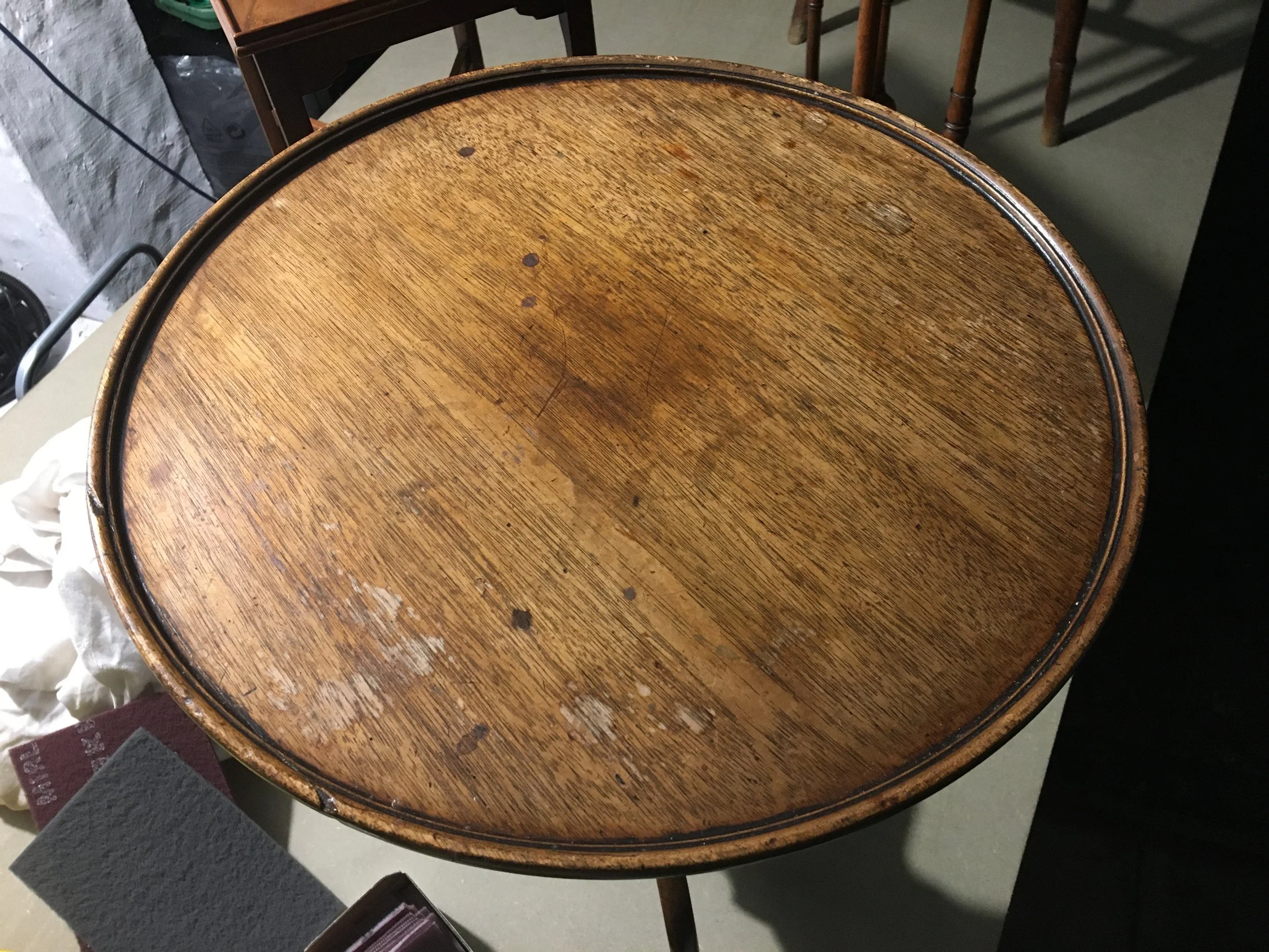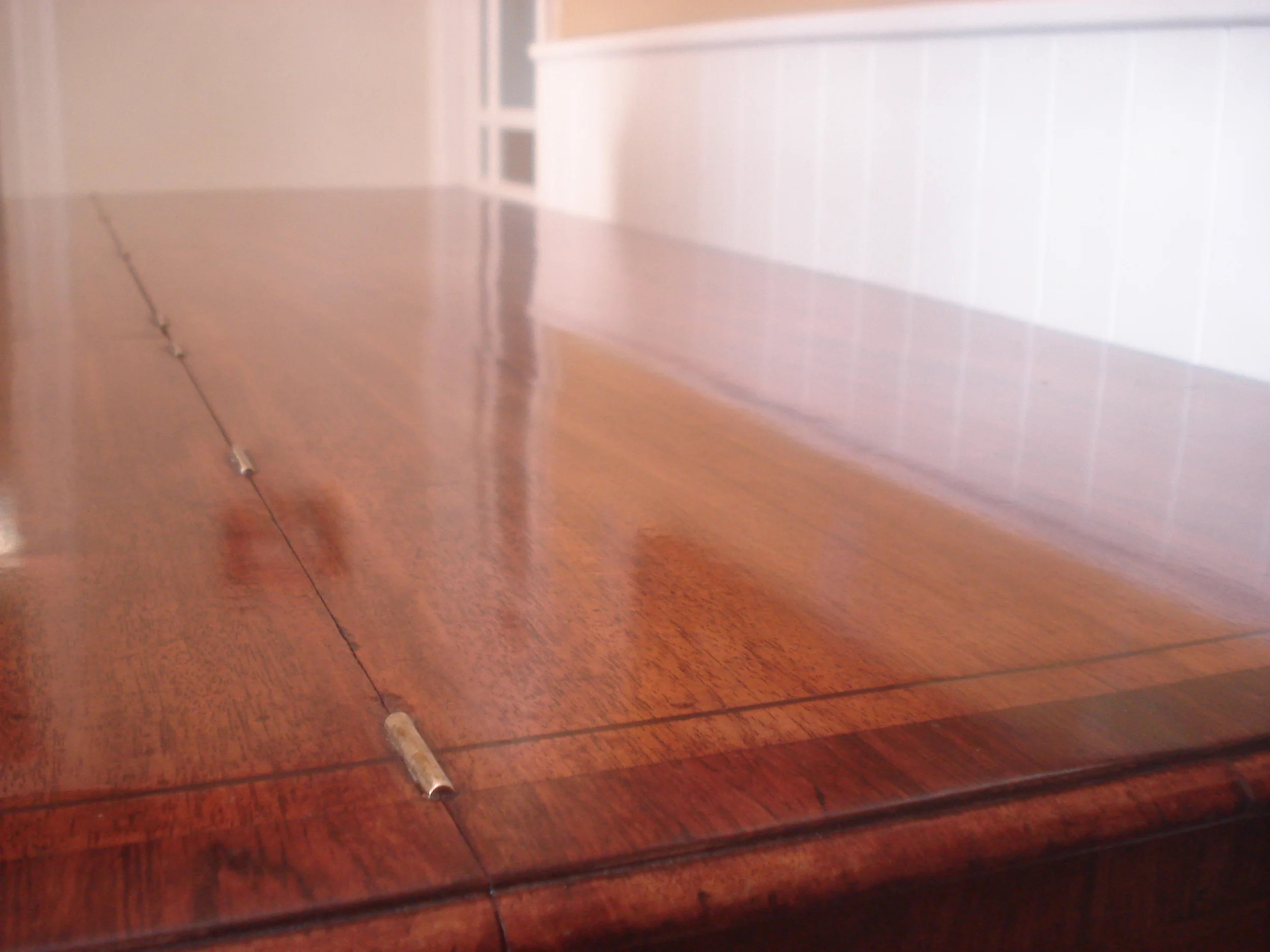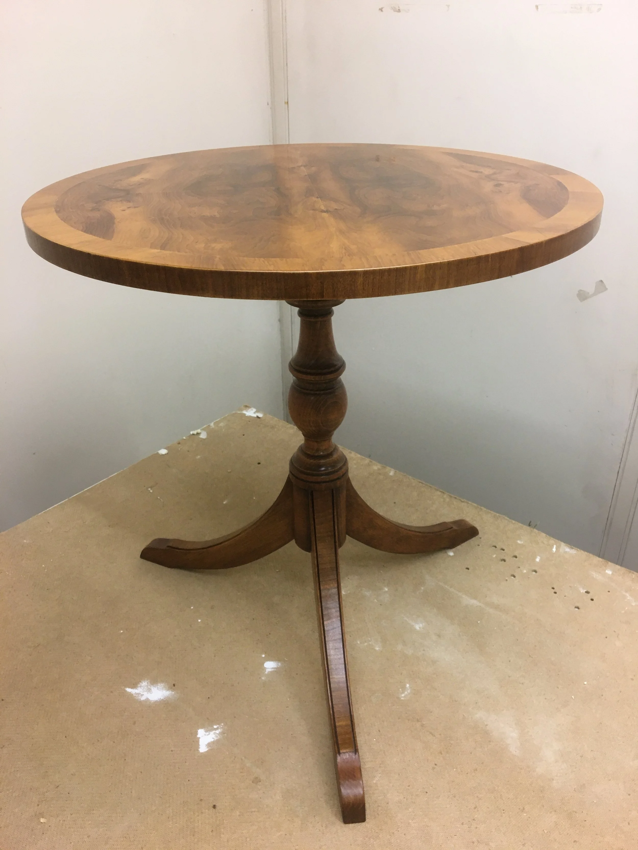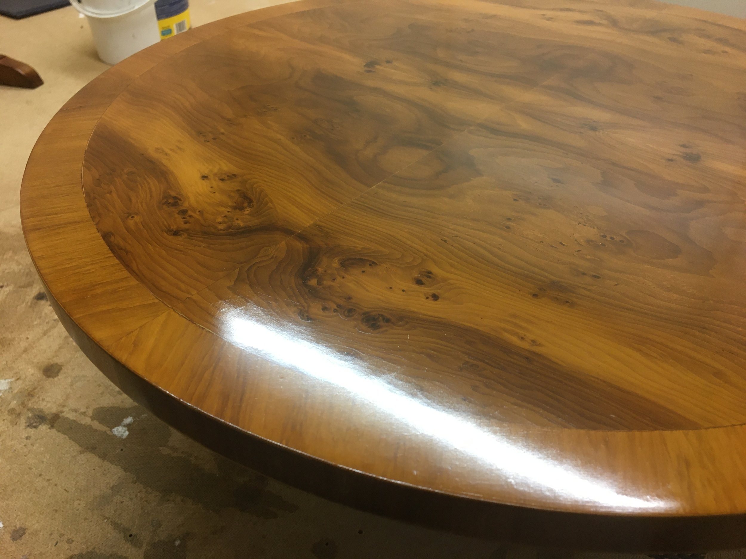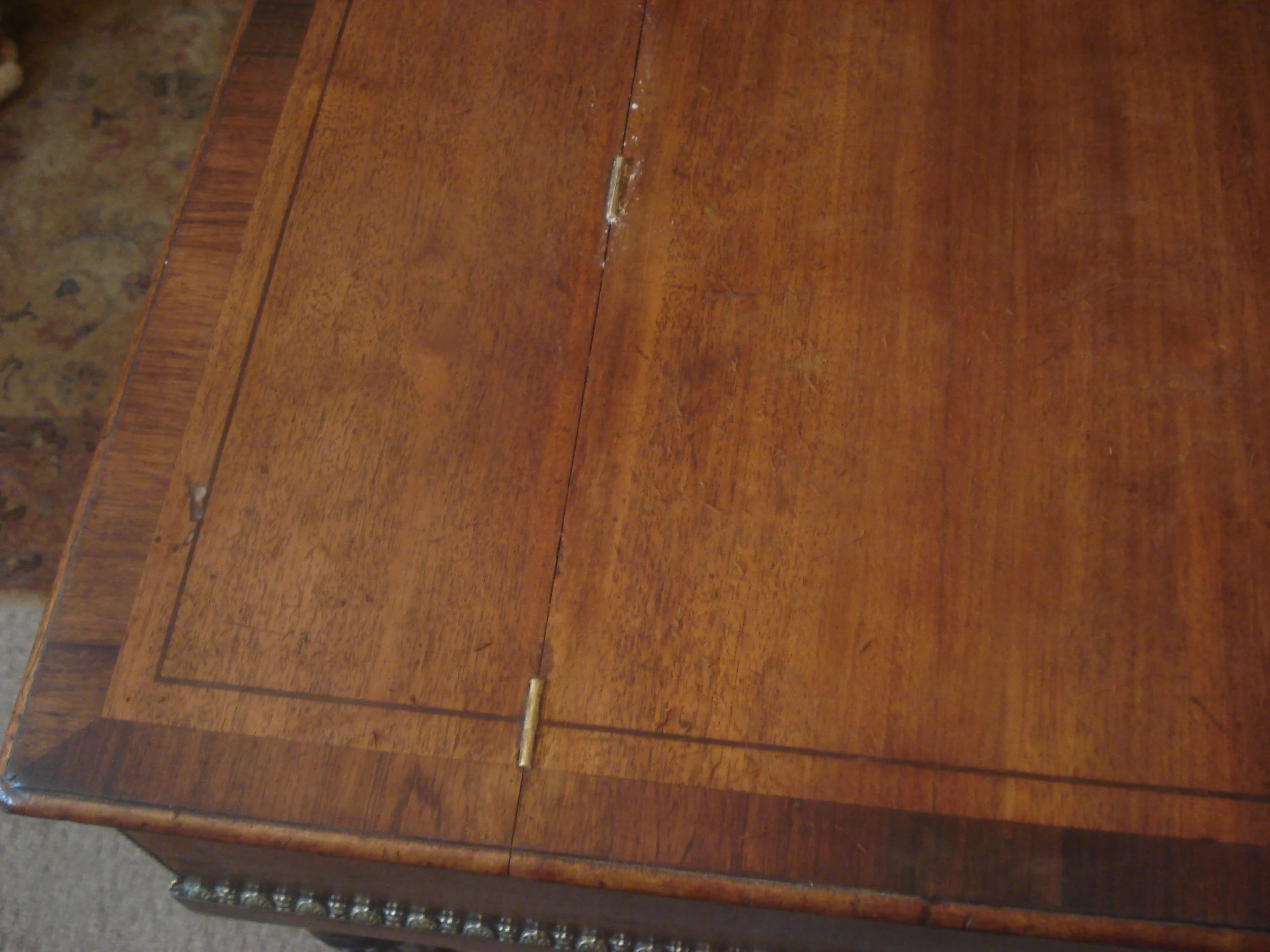 This table had a badly cracked modern lacquer type finish, all sanded back, re-coloured and French polished / waxed. The edge veneers were all in need of repair also.