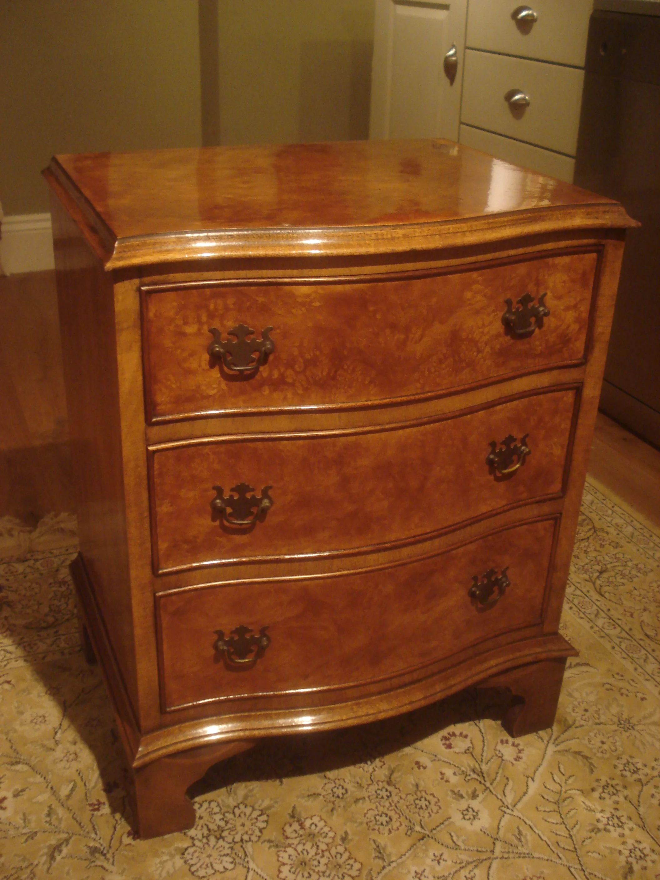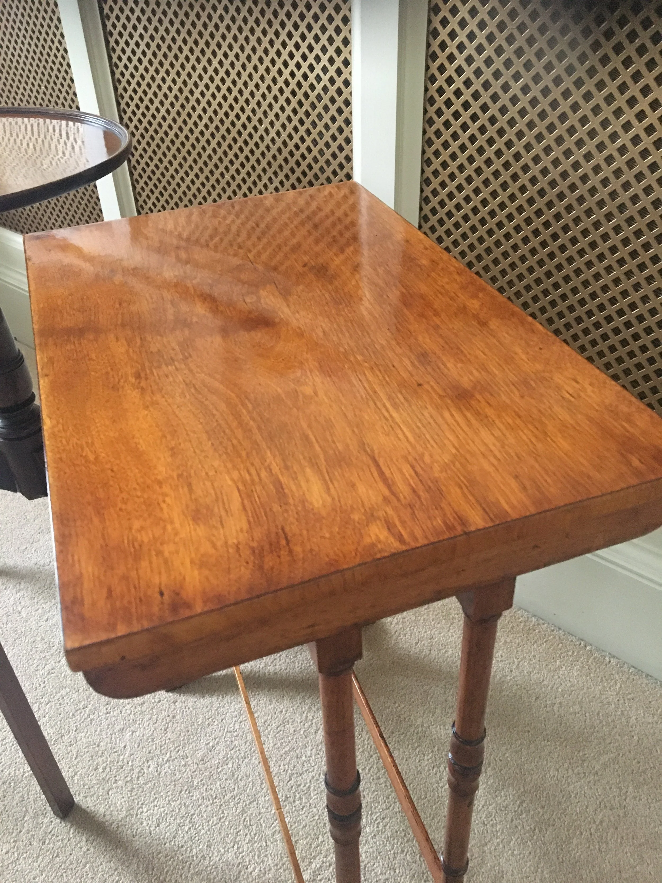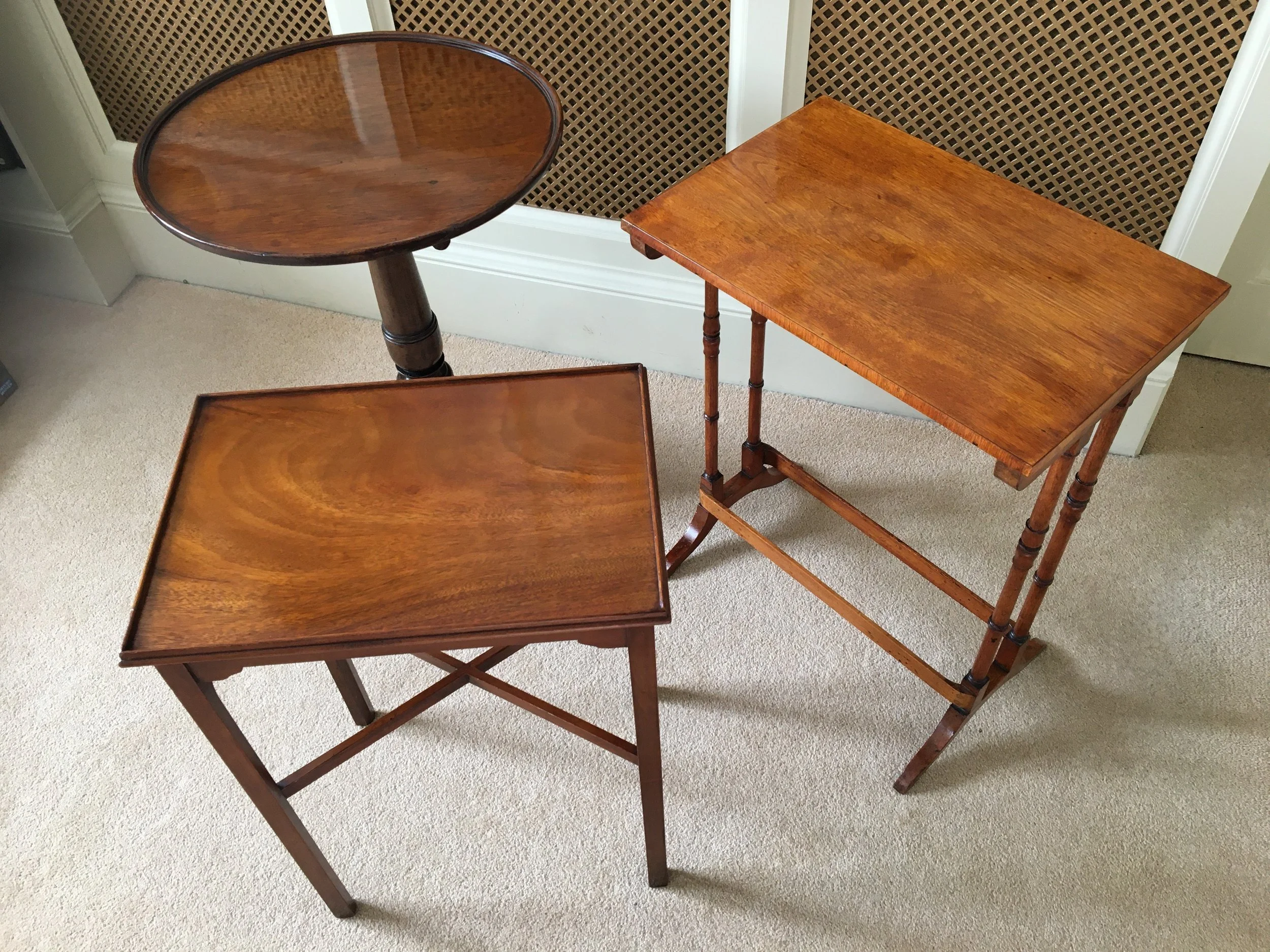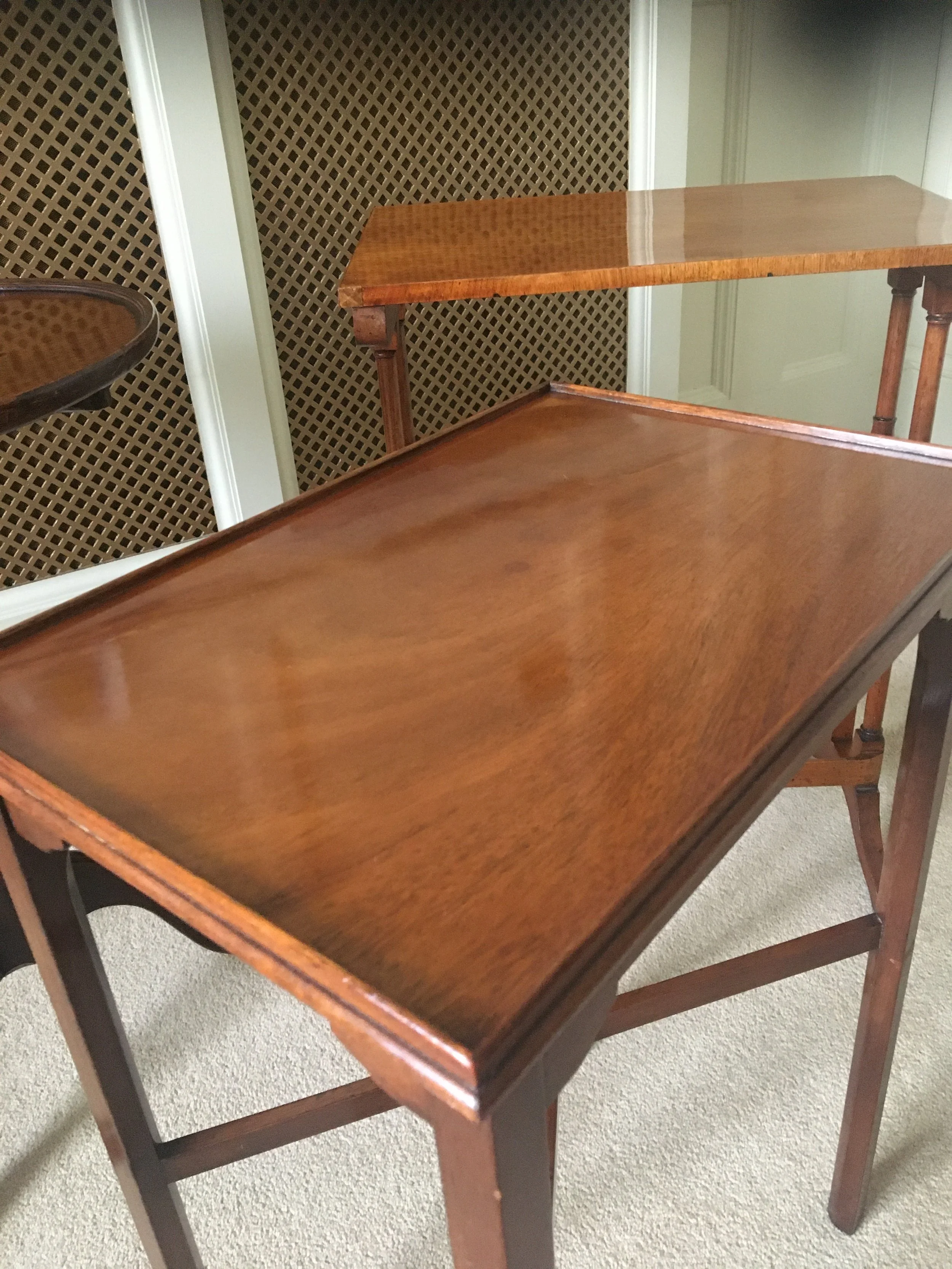 A selection of side tables, all suffering from the usual common problems. Discoloured / lightened by UV, cracked and flaking surface finish, staining and general wear and tear. I strip, sand, colour / stain, grain fill, french polish and wax to bring them back to life. French polishing can be labourious but it truly is a first rate finish! The polish produces a fine smooth surface that lets the light through and refract off the timber below, very attractive indeed.