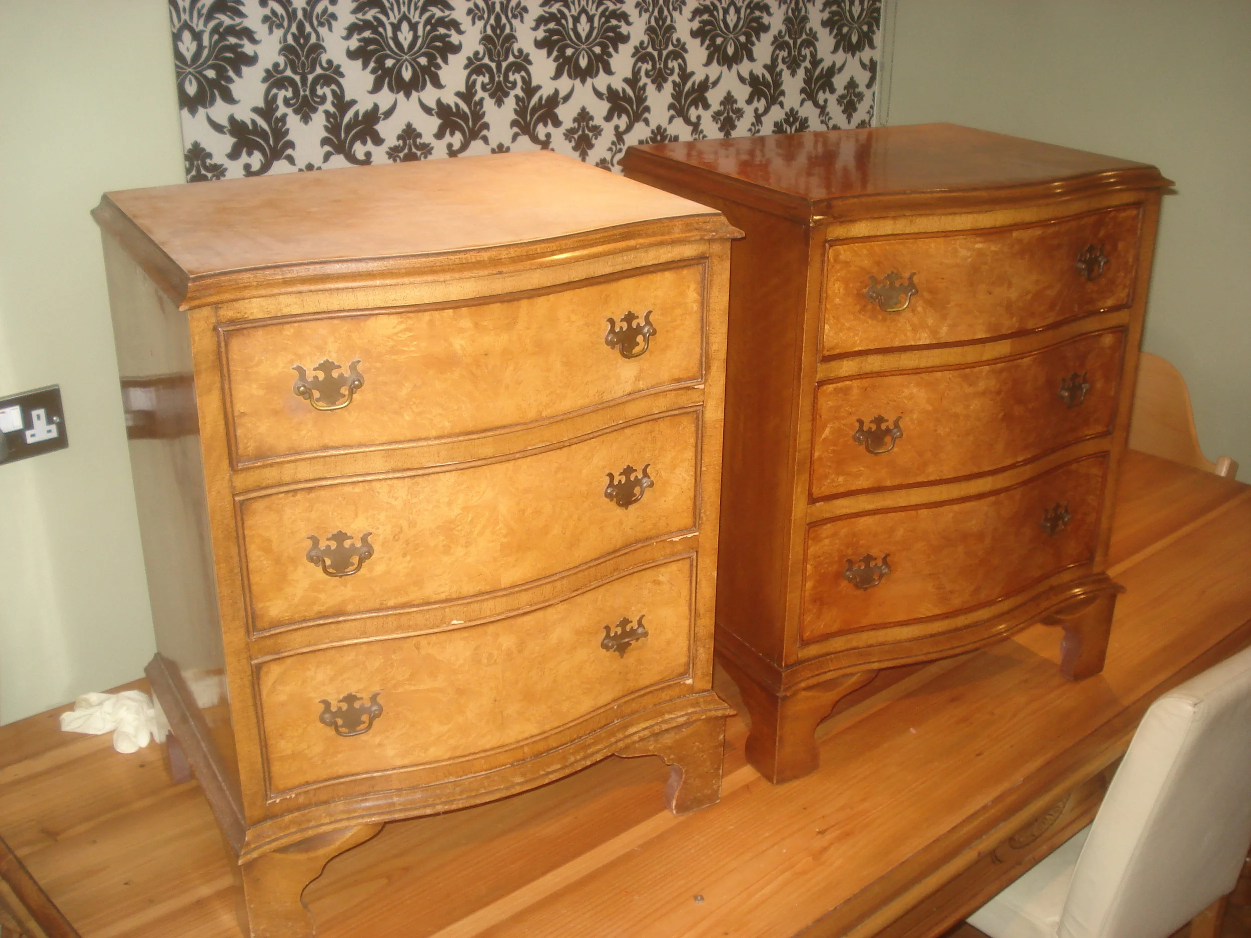 A pair of cabinets, scratched & very faded - many years in the sun! The original colour was found behind the handle plates. They were stripped, coloured, French polished then waxed.