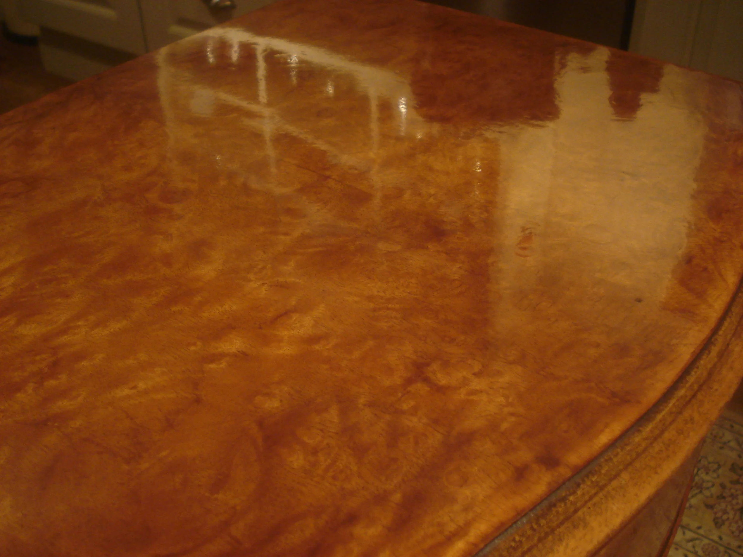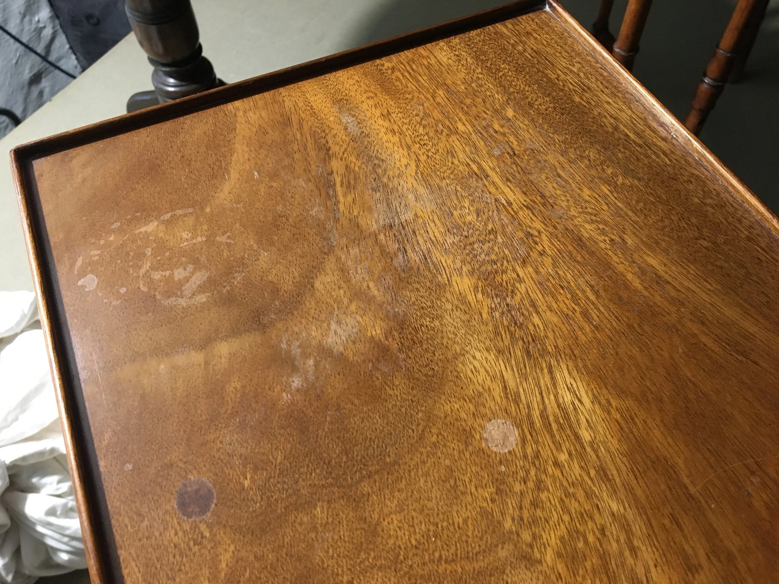 This piece came to me with a large black watermark on the lid where a plant had been standing for years. There was also lots of cross grain scratching beneath the surface. The old finish had to be removed to clean up and remove scratches, once I had the stain out, the whole was French polished & waxed.