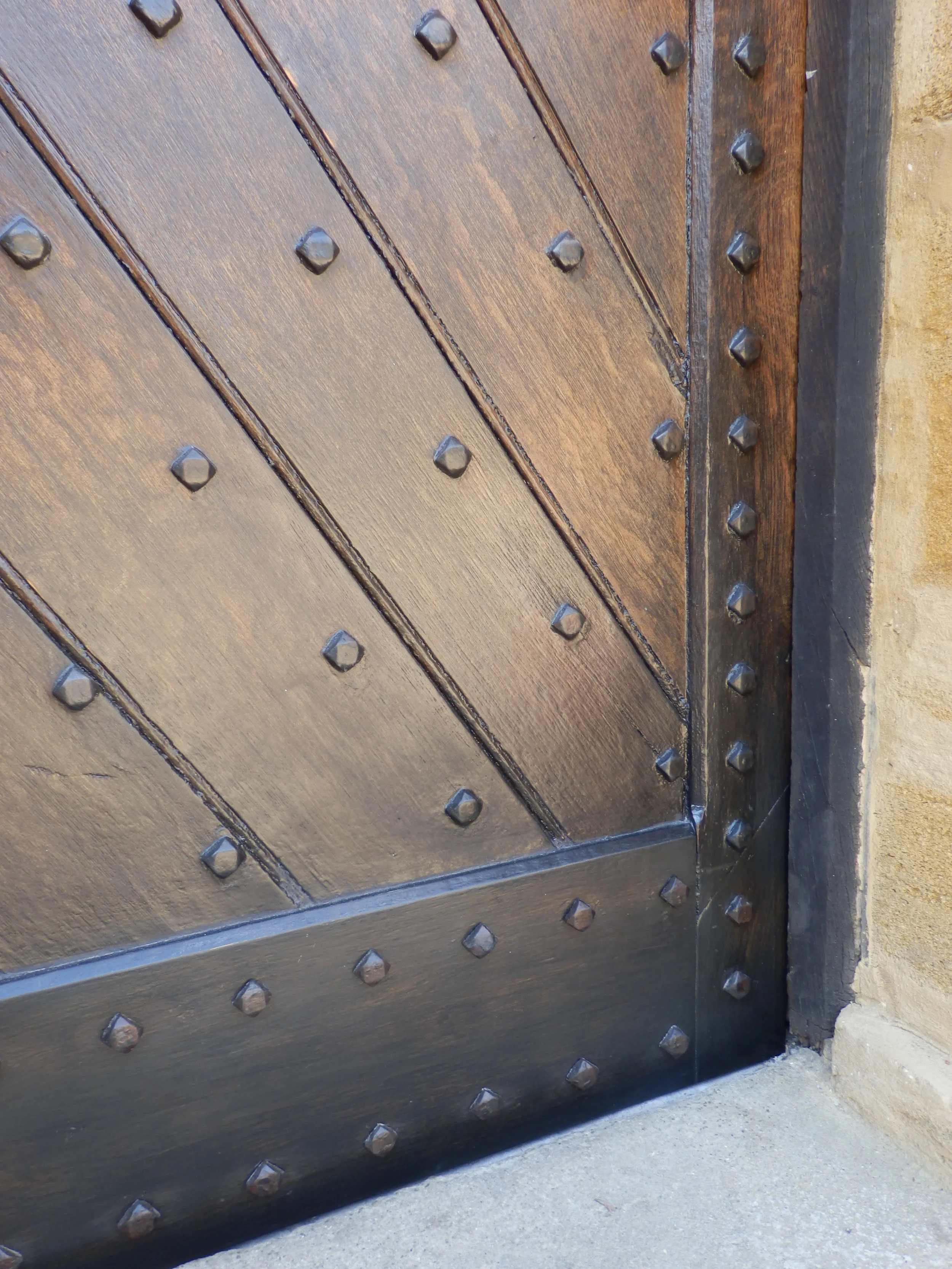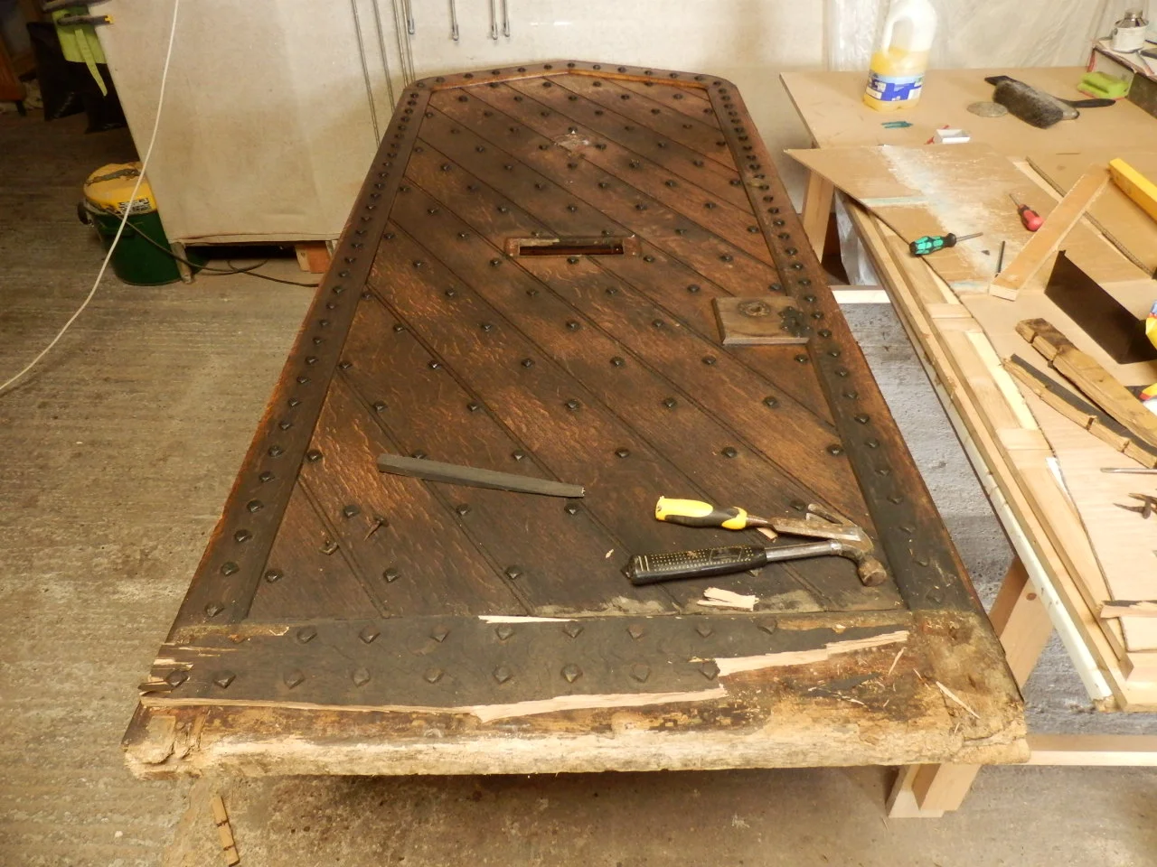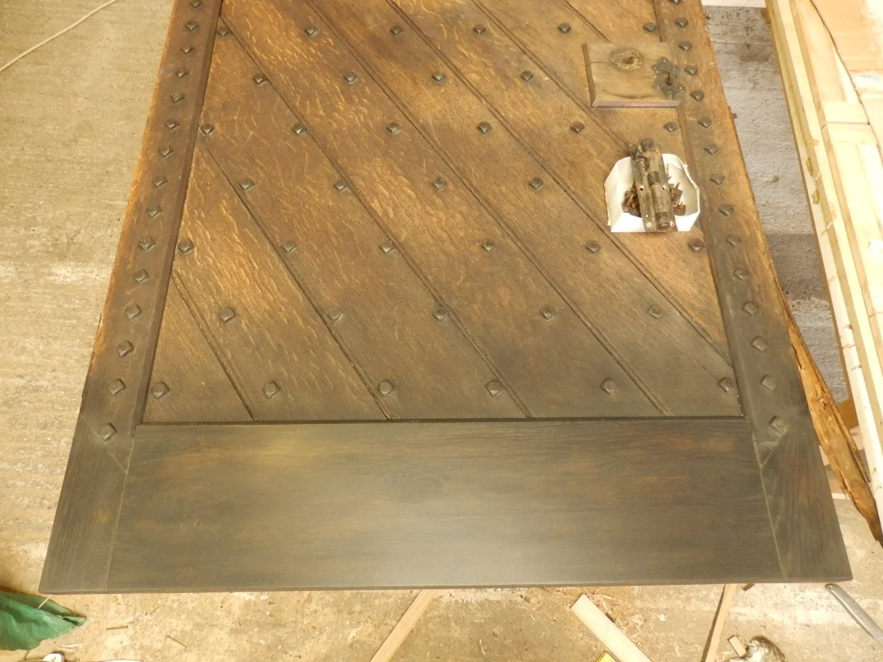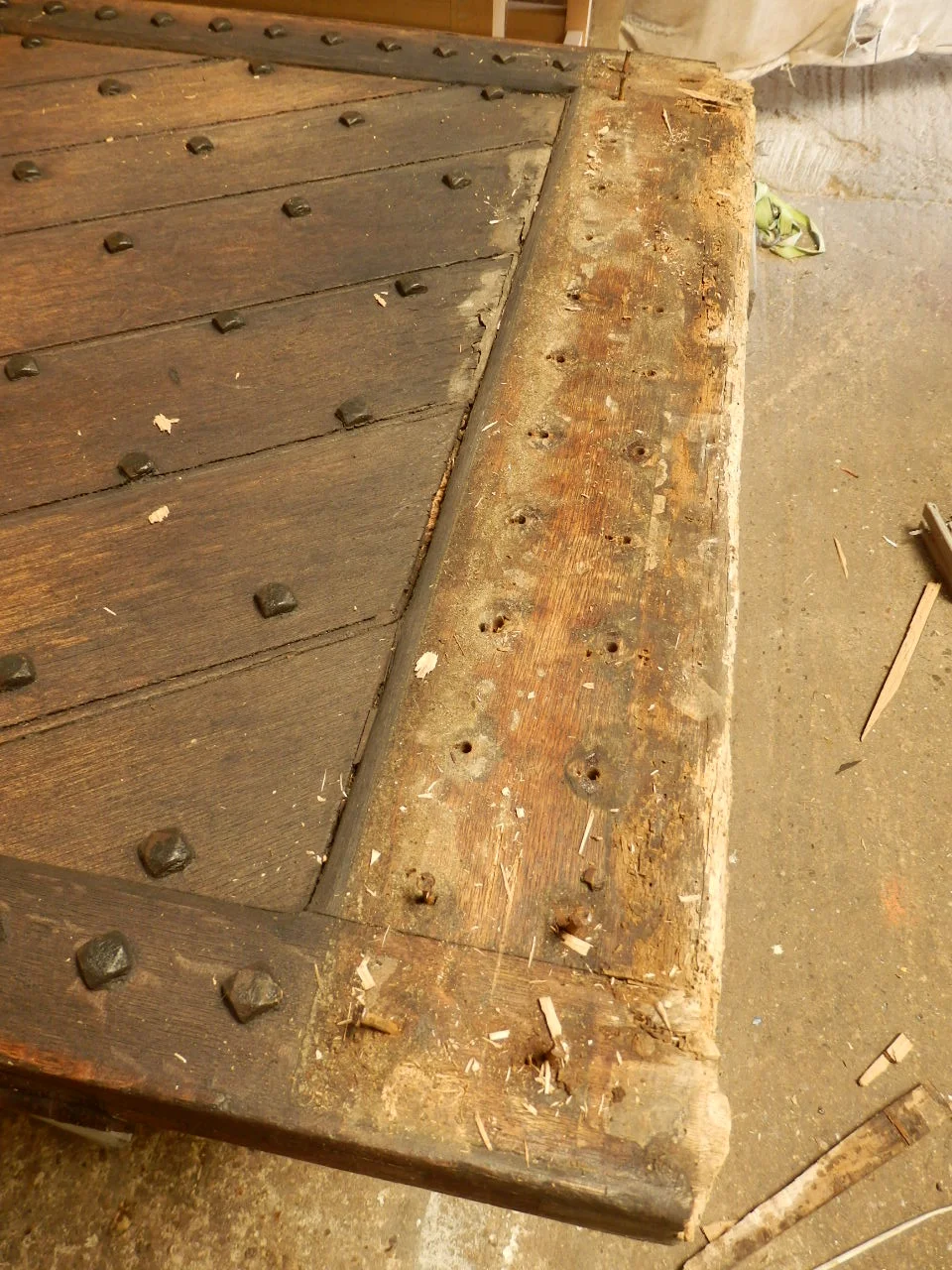 The third door was in the poorest condition. This door took all the weather and had suffered badly for it. The whole of the the exterior planking was beyond repair. This was all made new from selected oak and the door was re-skinned completely. The 'inside' of the door was dried and treated before repairs were made. The studding had caused major splitting and staining to the original timber due to years of movement / weathering. It was decided that it would be better left off to ensure longevity of the timber. The base was epoxy filled and sealed to prevent future rot.