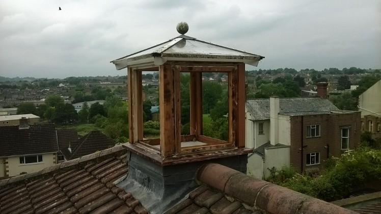 Poor quality timber and paintwork caused extensive rot in this tower skylight. The glass panels were failing due to exterior glazing bars, handling tape left on the double glazed units and poor silicone / sealing. Three of the main corner posts had rotted along with two windows and a few sections of framing. All replaced / repaired / reglazed and repainted with Zinsser & Farrow and Ball paint. All interior woodwork was black stained from condensation, sanded, stained and oiled to refresh. A weather beaten location, restored and good for many years to come.