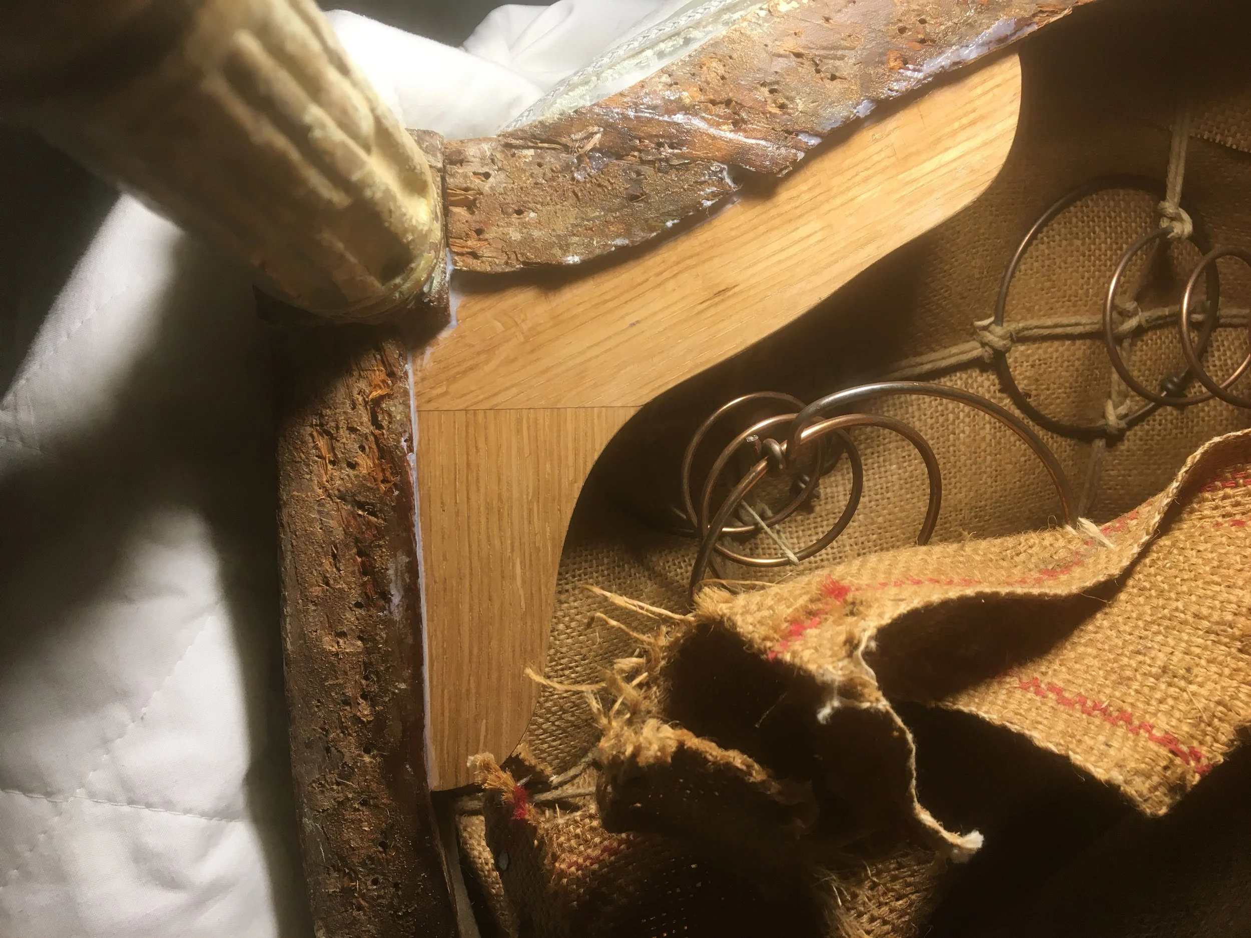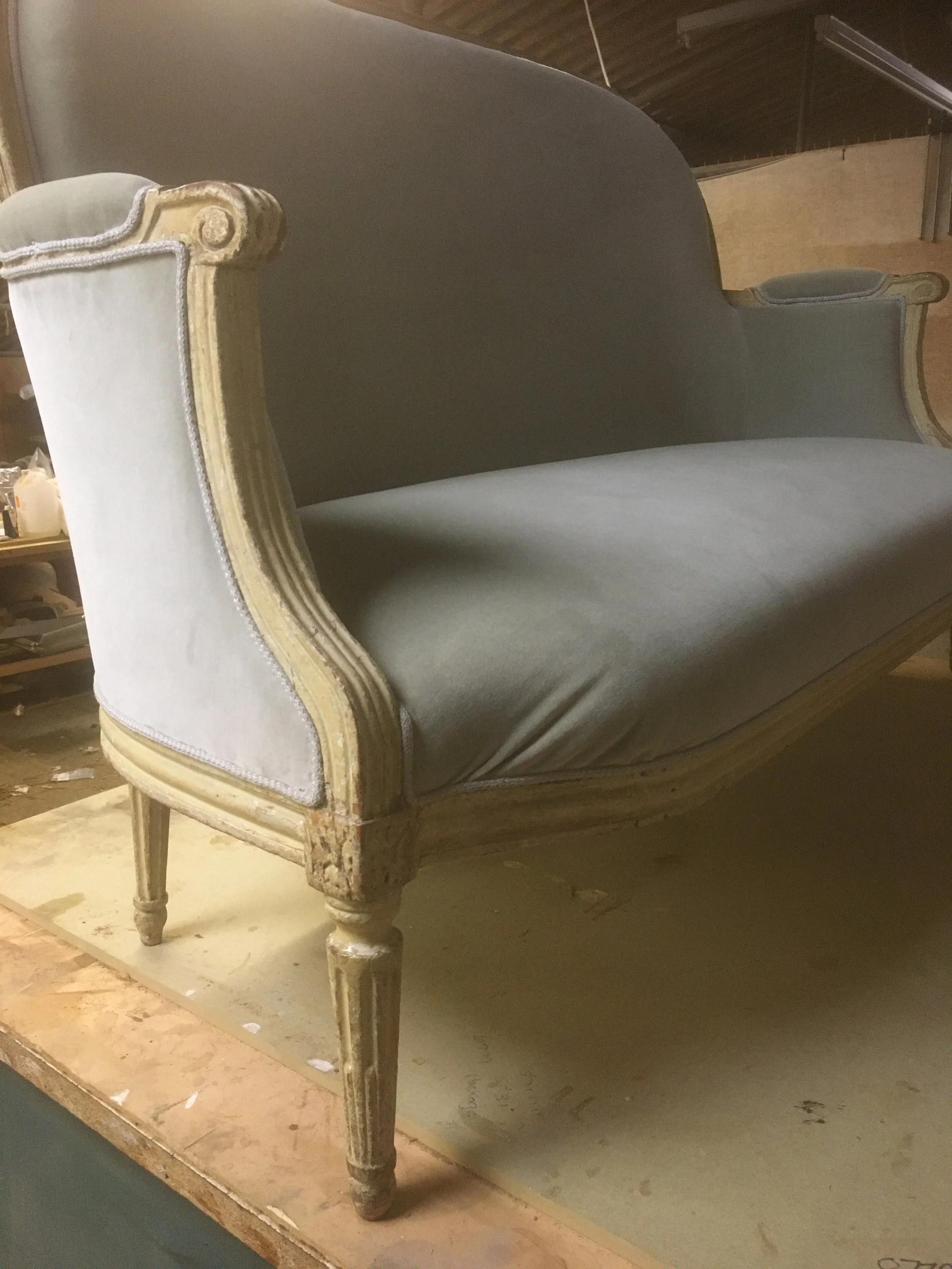 This over 200 year old settee had suffered a frame break near a leg. I made a composite oak knee and shaped it to fit the settee framework. Epoxy resin and screwed for a complete repair. This addition is well hidden in the internal fabric of the piece, the oustide area was painted and aged down to make the break invisible.